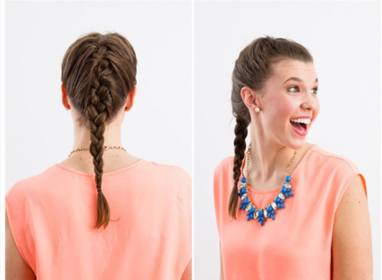 这一步有点难,不过你可以做到的!你的左手持着3股辫子,拉到左侧。你的右手从右侧拉起另外一股头发。