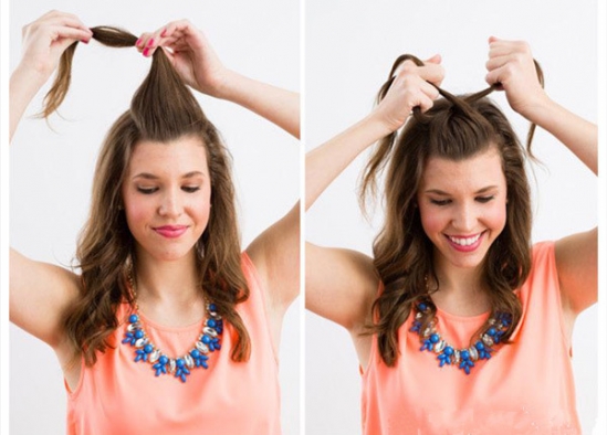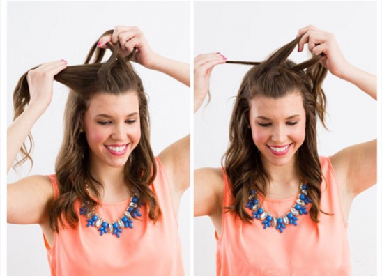 将新拉起的部分的头发越过原来的外片,再越过中心部分,按第2步了解将头发分成三股。