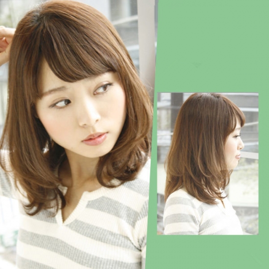 时尚看点:棕色染发使得这款齐肩内扣发型更加时尚,齐刘海也可以拨成斜刘海,发尾有层次烫卷翘,脸颊两侧的卷发蓬松后很好地帮助瘦脸。