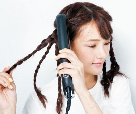 用直发夹夹住辫子,每段都约停留3秒,让头发塑形。