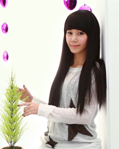 时尚看点:这款垂顺直滑的直发发型将女孩子俏皮可人的清纯甜美气质展现的淋漓尽致,额前整齐剪裁的厚实齐刘海完美修颜,而深黑发色沉稳更是显得大气。