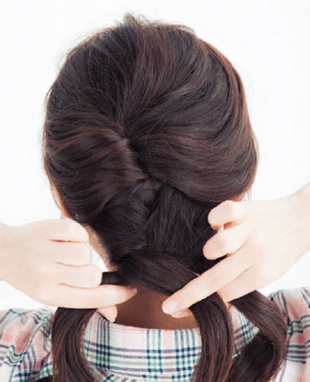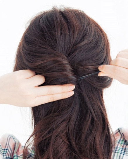 取出上半部分头发扭转成内扣发辫后用发夹固定。