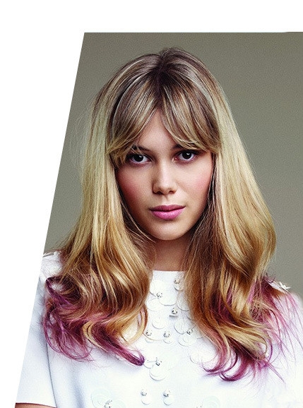 时尚看点:淡金色长发在发尾渐变为桃红色的长卷发型,既个性又吸睛,微卷的发尾和微中分的刘海让女生的脸看起来更小更尖。