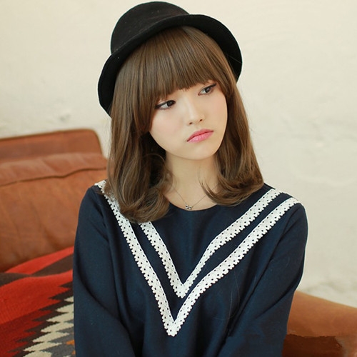 时尚看点:这款栗棕色的染发的韩式梨花头发型十分显时尚,轻盈内扣烫卷的发尾轻松衬托出女生可爱的小脸蛋,配上一款修颜的齐刘海后更是惹人,加上黑色小礼帽的点缀,又增添了几分学院风气息。