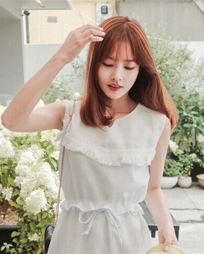 时尚看点:这款棕红色的齐肩卷发发型色彩鲜明吸眼,那微微内扣的发尾自然洒落在肩头,给人的感觉是那么的甜美与浪漫,搭配一款韩系稀薄的空气刘海,更显修颜显韩范儿。