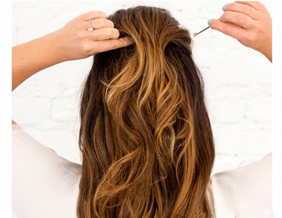 再将头顶的头发分为AB两部分,后面B部分的发量要多一些,将其拉向后脑勺,而前面比较少的A部分可以先用夹子或橡皮筋固定一下。