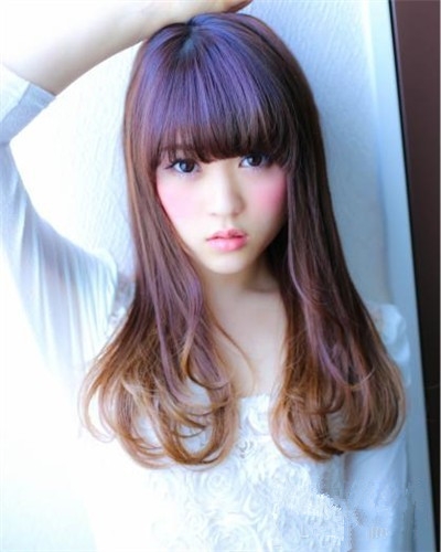 时尚看点:紫色与棕色漂染的这款中长卷发显尽女生潮流范,同时也让吸眼指数倍增,内扣烫卷的发尾垂落与胸前,给人的感觉是那么的唯美迷人,配上一款修颜的齐刘海后更是完美。