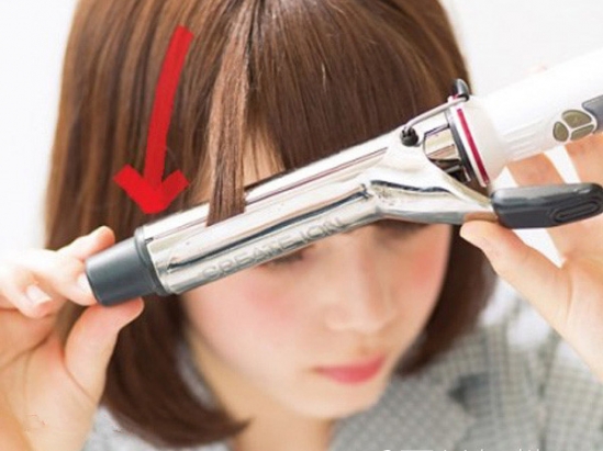 再将刘海分成一小部分,用卷发棒将刘海发尾向内夹卷,卷出内扣的效果来。