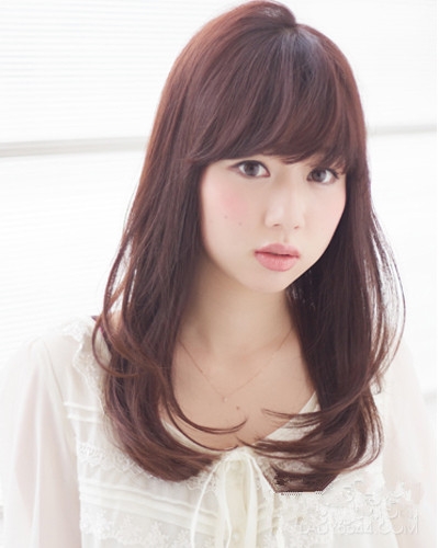 时尚看点:比较清纯范儿设计的这款圆脸发型,利用厚重的平刘海稍微斜分给人可爱甜美的感觉,但也不会显得太过于稚嫩,搭配微微烫卷内扣的巧克力色卷发,让修颜减龄的效果达到极至。