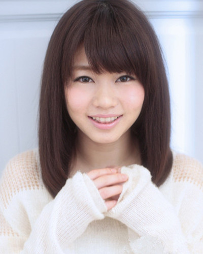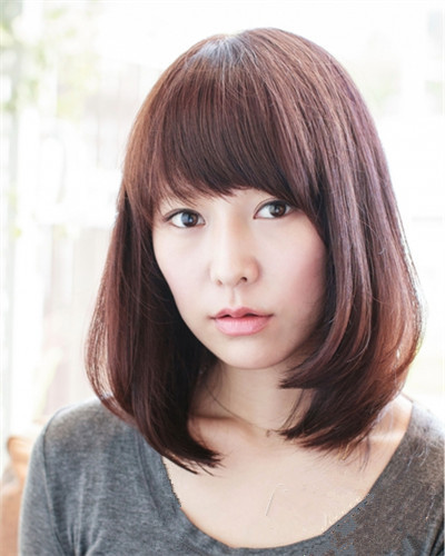 时尚看点:这款圆脸中短发发型利用紧贴脸颊两边的直发来为脸型修颜,在视觉上具有显显脸小的效果,加上一九分发的刘海搭配,瞬间让圆脸变成可人的脸蛋。