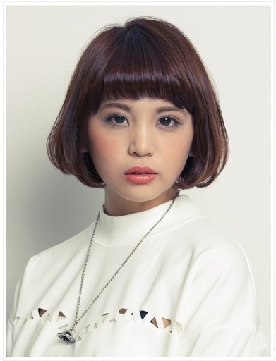 时尚看点:这款小脸适合的梨花头发型搭配一款厚重的齐刘海,既衬托出一双迷人的大眼又显露迷人的小脸脸型,微微烫卷的内扣发尾包裹着脸型,轻轻就能起到修颜作用。