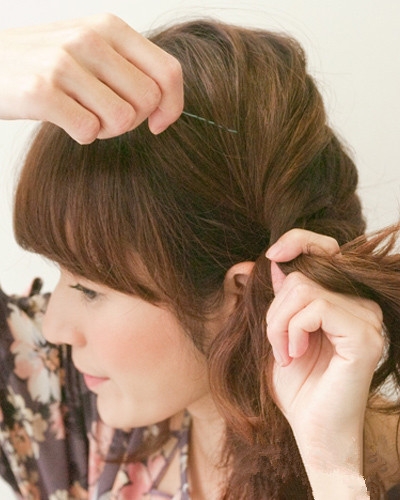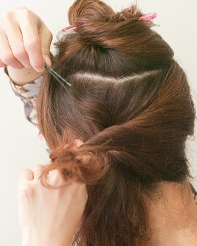 将上面的头发放下同样向左侧扭转固定。