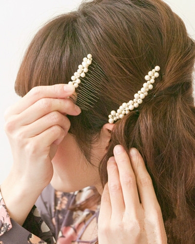 将另一侧头发同样向左侧扭转,用发夹固定好。