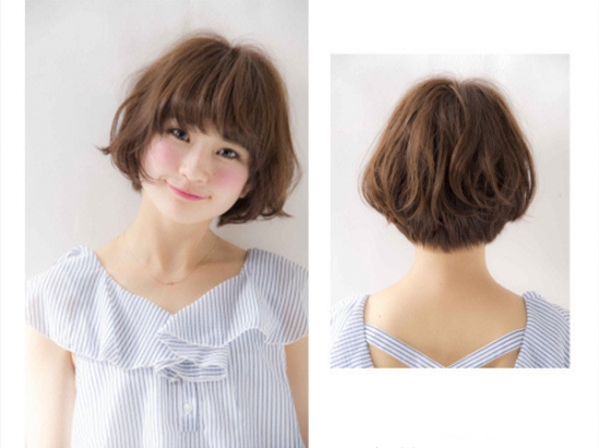 时尚看点:及眉的刘海层次剪发,使得头发向上方和两侧拉扯蓬松,突出MM明亮的大眼和精致的小脸,后脑的头发经过层次处理之后空气感较强,让头型看起来更加的饱满圆润,整体发型简单清爽,带点小女生的娇羞。