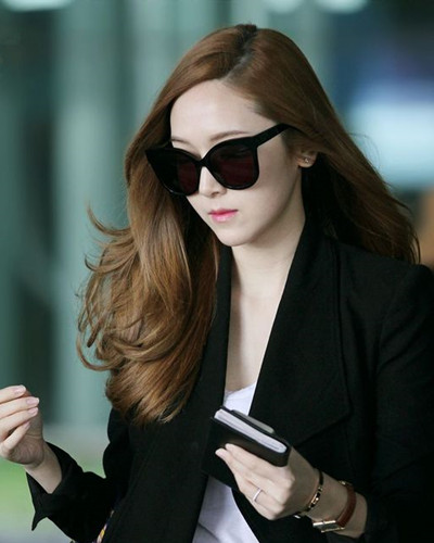 时尚看点:时尚棕色染发的这款中长发发型,将Jessica郑秀妍的时尚气质展现得淋淋尽致,那唯美的头发散落在左肩部,散发出十足的超强气场哦,配上黑色墨镜后略显酷感。