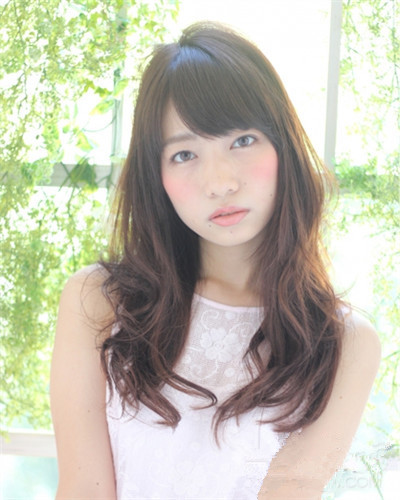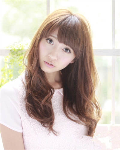 时尚看点:额头不太完美的女生可以选择这款借助齐刘海来遮盖,这样看起来会更加的自然一些,两边款款而落的中长发卷发可以很好修饰脸颊,可以轻松勾勒出一张俏丽的瓜子脸,选择深棕色的染发会比黑色更显得柔和,对于女生来说是提升柔美感很不错的选择。