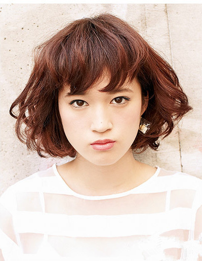 时尚看点:这款咖啡色波波头短发散发出浪漫的色彩,让发型看起来更加的吸眼迷人,采用蓬松感设计的烫发可以让娇小的头瞬间丰满了不少哦,加上齐刘海的到后就更加的完美动人。
