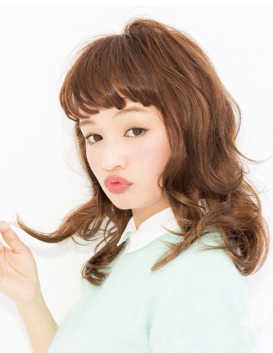 时尚看点:蓬松感的这款中长发烫发发型看让整个头型十分显饱满圆润,根根分明的别致刘海尽显女生俏皮可爱气质,而那随意随意摆动的中长发卷发,既显时髦感又十分的可爱动人。
