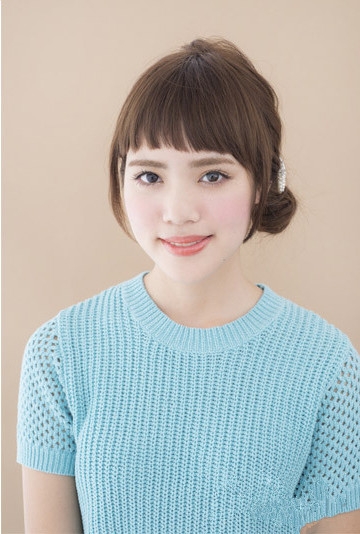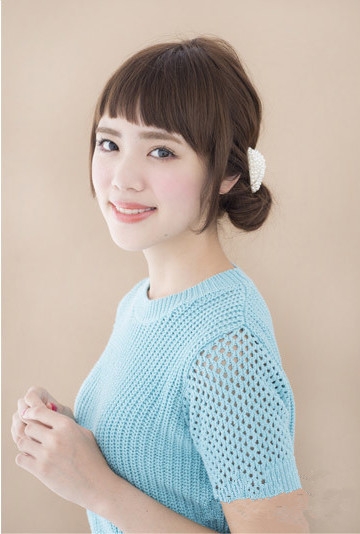时尚看点:十分显女生甜美气质的一款低丸子头扎发发型,让人就喜欢不已,配上遮盖住额头的碎发齐刘海展现出女生纯纯的美感,而那遮盖住两边脸颊的略长头发可以为脸型起到良好的修颜效果,加上低垂马尾设计与精致发饰的点缀,瞬间点亮整个丸子头的时尚与甜美感哦。