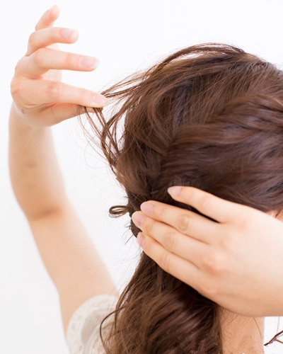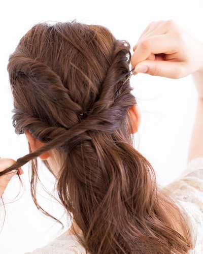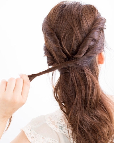 分别从左右两侧取出头发扭转成发辫后固定在脑后。