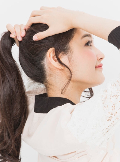 用手指将头发理顺成高耸的马尾