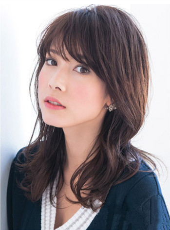 时尚看点:稀薄的微斜刘海不仅修饰脸型更是让衬托出一双迷人的双眼,搭配淡淡的棕色染发可以使得中长发更显潮流风味一些。