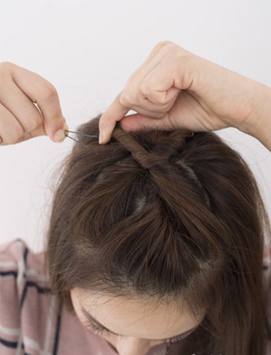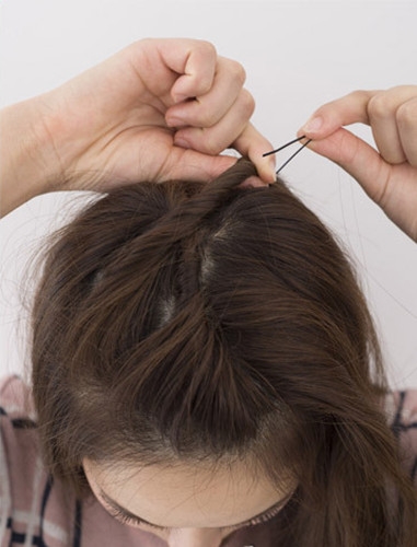从右侧再拉扯出一束头发缠绕成发辫并固定。