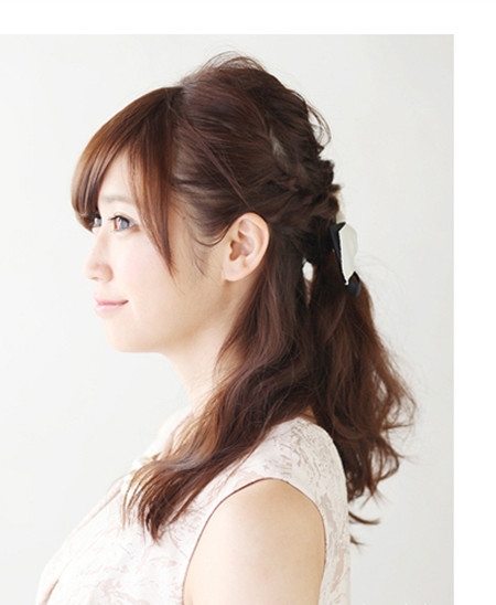 时尚看点:这款发型采用公主头编发的方式来营造出女生那甜美的气质,两边的发丝自然披落在双肩,给人的感觉是那么的甜美显魅力,而那修颜修脸的斜刘海更是为造型增添了些许气质,加上精致的发饰点缀就更是时尚吸眼了。