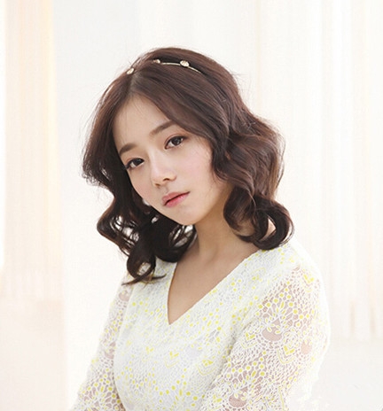 时尚看点:具有韩式风味的这款甜美公主头短发,想必是很多少女的最爱,款款而落的蛋卷烫发散落在肩头,给人的感觉是那么唯美与清新,而那中分发的设计更是凸显出女生精致的V脸型,最后还加上精致发箍点缀,那就更加的完美吸眼。
