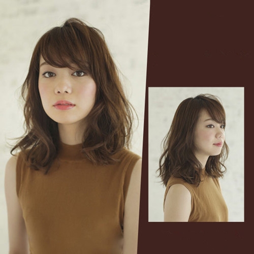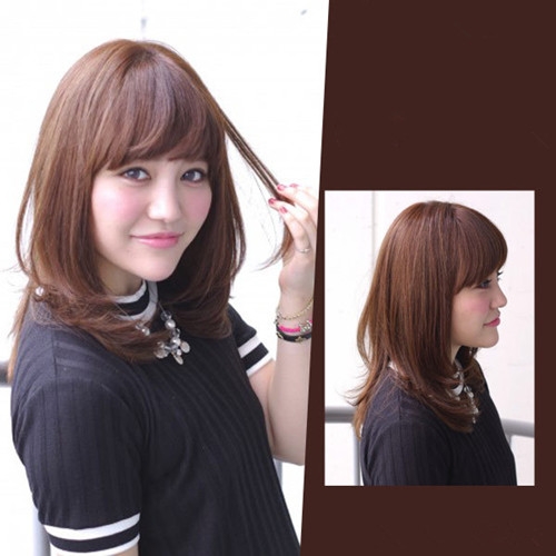 时尚看点:这款简单的中长发发型染发时尚的巧克力色,瞬间就为造型增添了些许了大气感,而那微微内扣的发尾散落在肩头,既修颜十足又显女生甜美气质,配上可人的刘海后使得整个造型更加的时尚好看了。