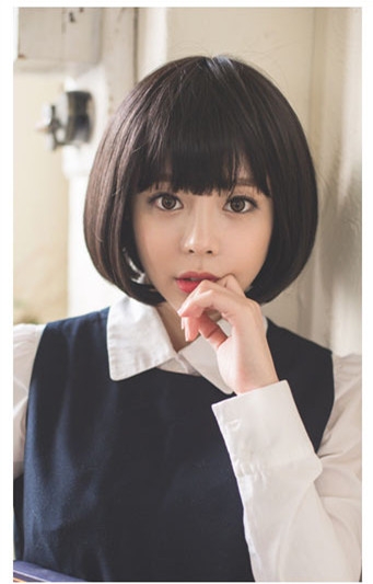 时尚看点:这款纯黑色的波波头短发发型显得发质十分的柔顺好看,搭配一款稀疏的过眉刘海,完凸显出女生那可人的大眼,加上然内扣的发尾的设计感让整体显得十分俏皮可爱。