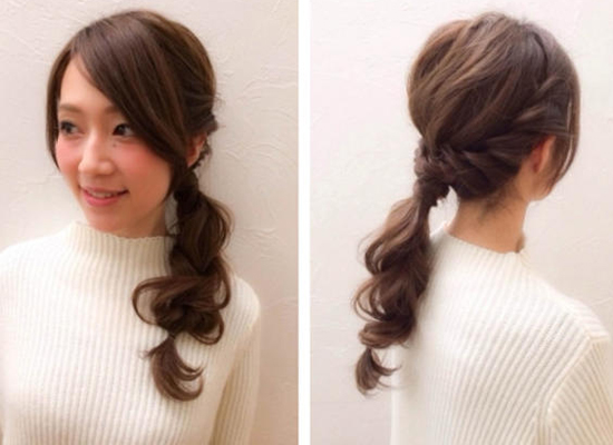 时尚看点:简单的低马尾扎法,不费时间又简单!很适合长卷发的女生,蓬松的马尾卷发加上留出的斜分刘海,显得十分甜美,没有多余的头发披散,显得十分干净利落,对于上班族来说也是一款极佳的长发发型选择!