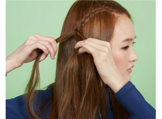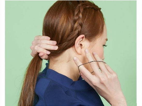 在差不多到太阳穴的高度时,又将辫子往前方耳朵的方向编织。