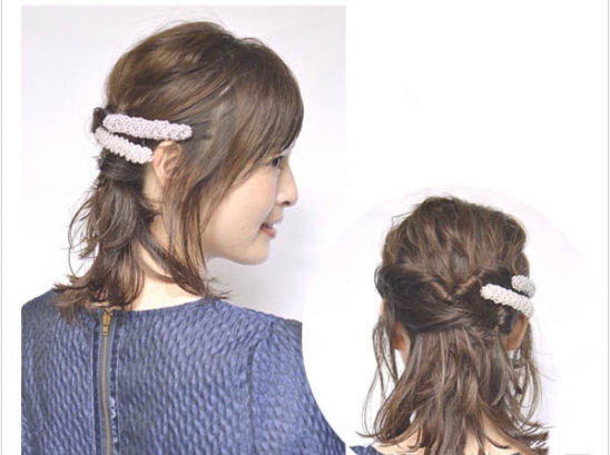 时尚看点:这款中短发扎简约的公主头发型,虽是带点慵懒感却一点也不失甜美之感哦,扭转发辫的打造的这半扎公主头确实是别样风味,使得枯燥无味的中短发变得甜美吸人,加上那精致两个珍珠发夹点缀就更加的完美动人哦。