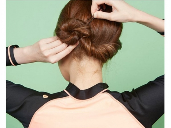 将另外一边散落的头发和扭卷辫子汇合起来,再一起扭卷盘成一个发髻,最后用多个发夹交叉固定好,就可以完成这款盘发发型了。