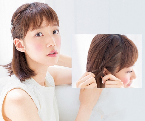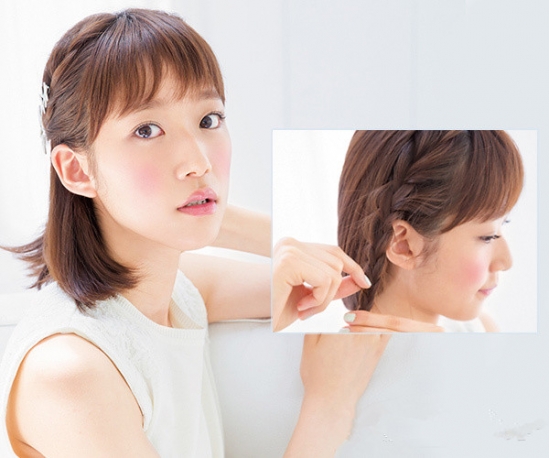 先用梳子将lob头发梳理通顺,再刘海后面两侧各取一小束头发编成三股辫。