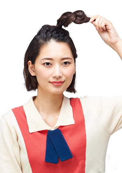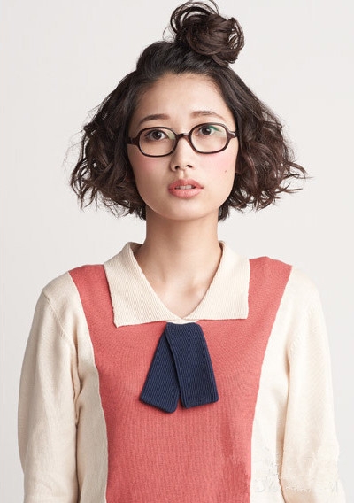 时尚看点:这一款短发刘海上梳造型,尽显女生可爱与俏皮的一面,两边吶蓬松感的烫卷头发不仅华丽个性更是让俏皮味道倍增,再将前额的刘海上梳弄成一个扭转成小发包,满满都是张扬着女生的可爱俏皮感。