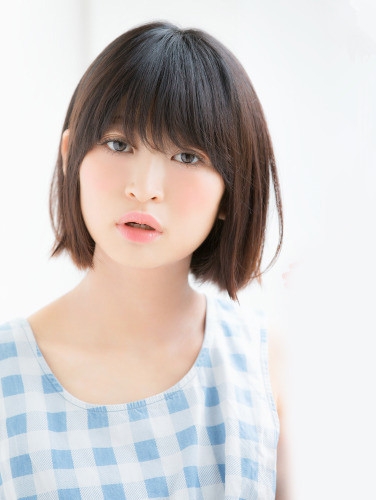 时尚看点:这款齐刘海与短发直发组合的这一款小圆脸发型,给人十足清新与甜美的感觉,整齐裁剪的短发让小圆脸型看起来更加的甜美与显小,配上清新的淡妆后就更完美动人了。