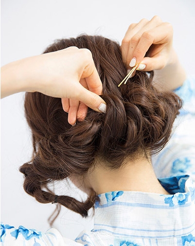 将辫子拉扯出蓬松的轮廓后用发夹固定。
