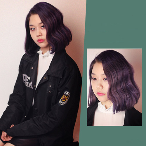 时尚看点:紫色染发的这款韩国女生短发发型尽显潮流风味,同时也是张扬出女生的个性与时尚,而那紧贴脸颊的大波浪烫卷头发,不仅显得女生时尚十分更是很好的修饰脸部线条。