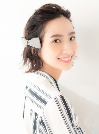 时尚看点:先来看看这款短发扎发发型,将前额的刘海与右侧的头发一起扭转成别致的发辫,轻松就显露的女生光洁的额头与甜美的脸蛋,同时也展现出女生清爽怡人的一面,最后还加上蝴蝶结发夹点缀就更是甜美十足了。