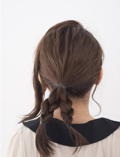 从左侧留出一束头发,再把脑后的头发绑成马尾后编成两只简单的麻花辫子
