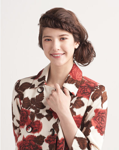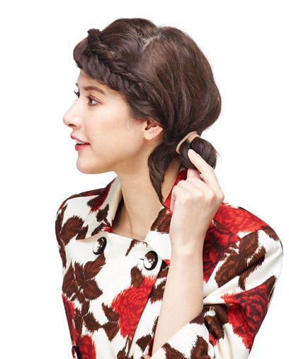 将发辫拉扯到耳后与头发一起绑成花苞头的样子。