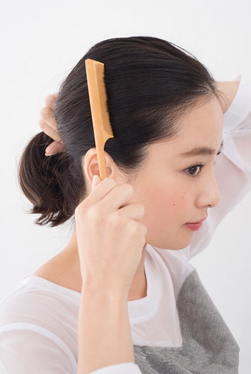 再用密齿梳将头发全部向脑后并束拢。