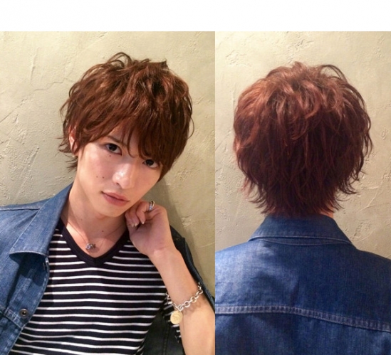 时尚看点:深棕红色的染发与烫卷的头发搭配,不仅时尚显潮男风味更是倍增男生迷人魅力,加上那遮眉微卷的刘海修饰下,让男生的脸型变得更加立体与好看。
