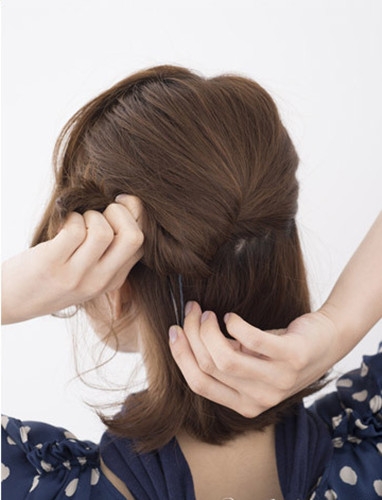 然后取出下半部分头发也扭转成发辫后用黑色小发夹固定。