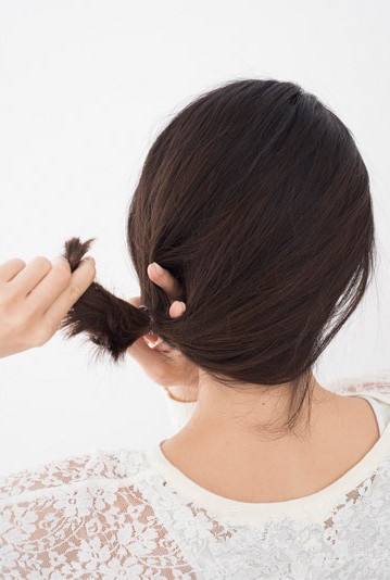从橡皮筋上方的头发穿插一个洞,然后把马尾从中穿插过去。