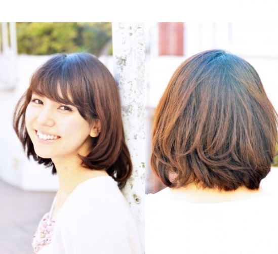 时尚看点:蓬松元素打造的中短发搭配上微微斜分的刘海,让一张小巧的脸型呼之欲出,此外还使得女生的甜美的气质尽显,加上深棕色的染发后就更是自然时尚了。