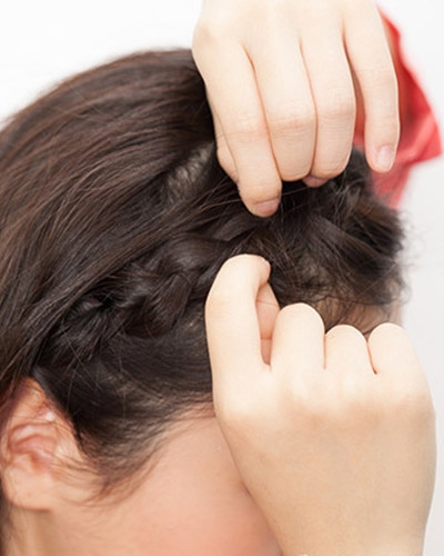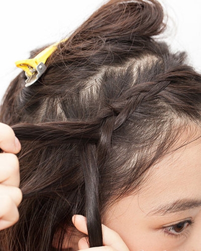 将前额的刘海编成三股麻花辫