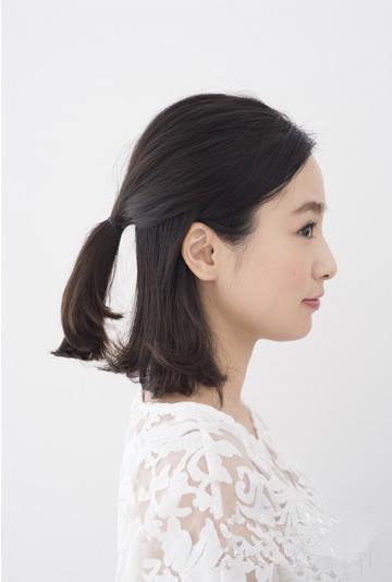 取出上半部分的头发,并用橡皮筋绑成马尾辫。
